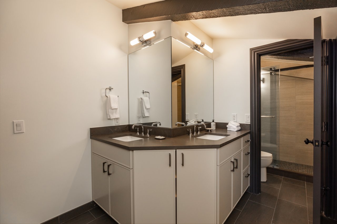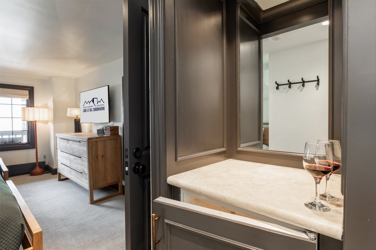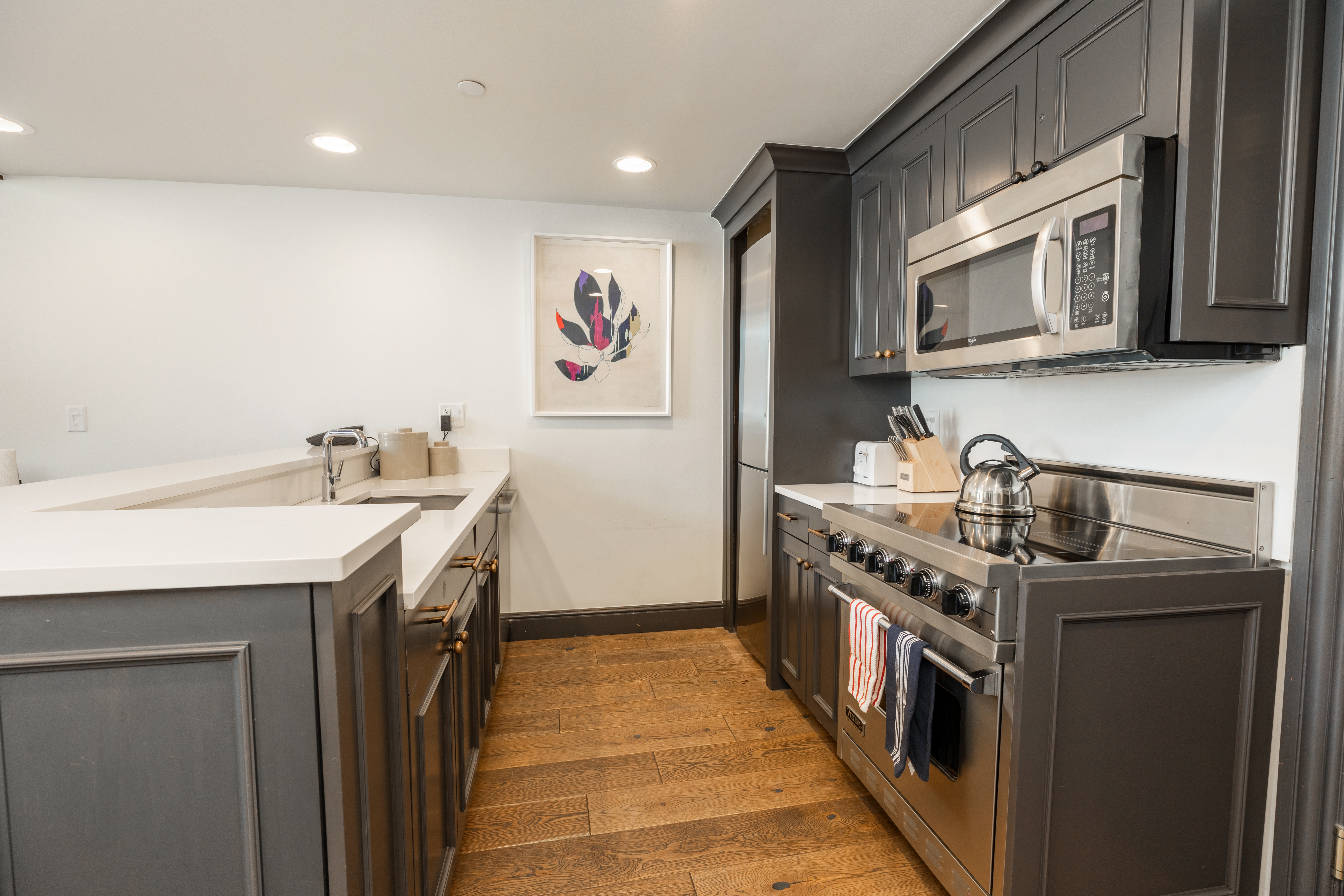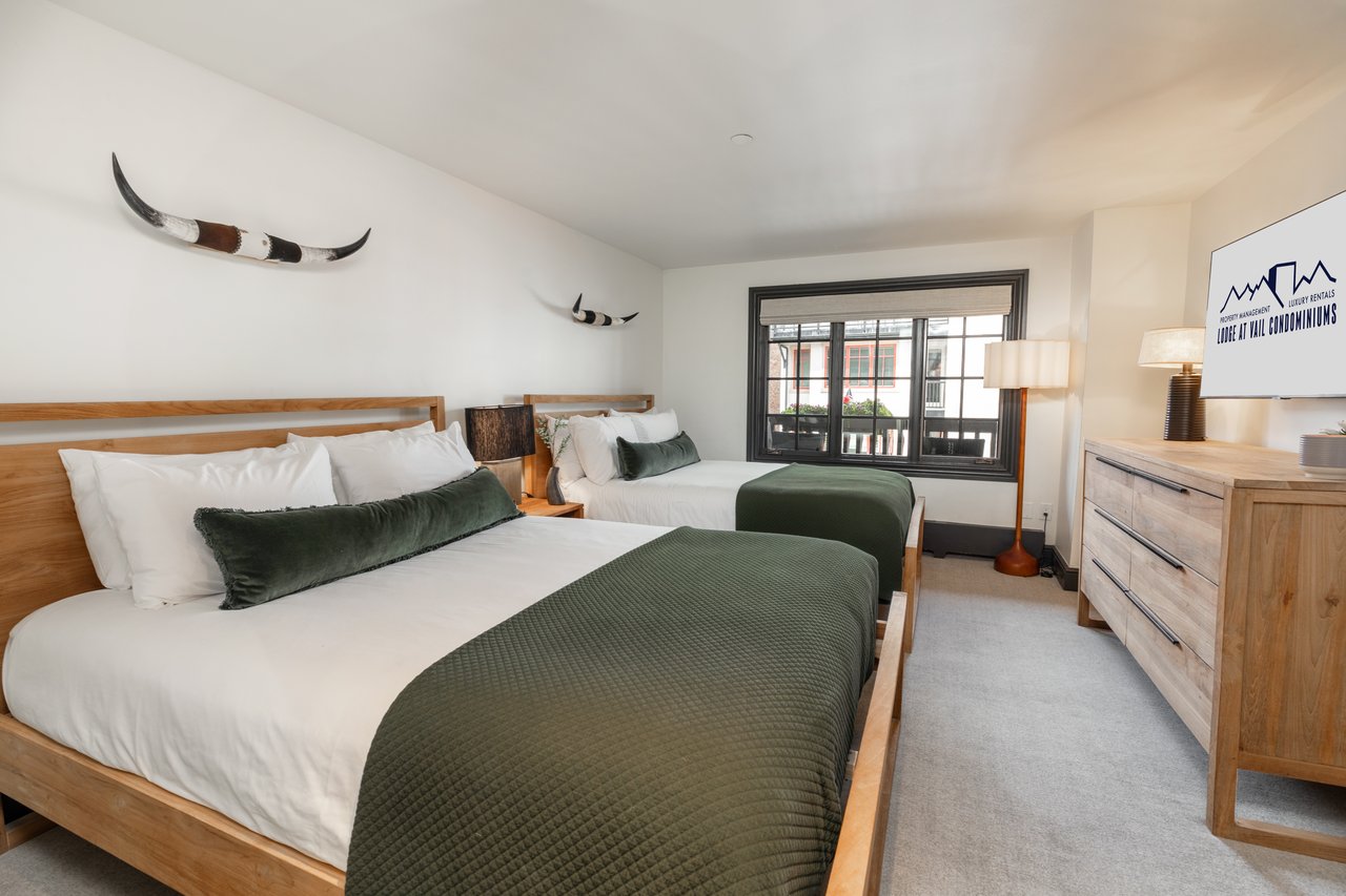 Decked in artful antlers and carbon gray woods, this stylish condominium is an exemplary mountain dwelling that overlooks Vail’s Gore Creek walkway. The condominium enjoys three delightful bedrooms and a full kitchen equipped with an oven, stove, microwave, full fridge and freezer, coffee maker, and dishwasher. Use the spacious dining table to lay out work-from-home materials or enjoy room-service dinners with friends and family. After skiing Vail Mountain, relax with a soak in the bathtub, build a roaring fire, and enjoy some fresh air on the outdoor deck featuring a privacy divider crafted from vintage skis.