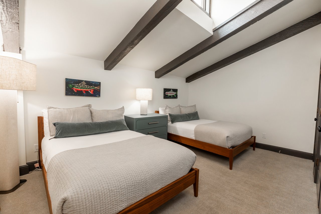 This condominium features an upstairs primary king bedroom, a downstairs bedroom with two queen beds, as well as an upstairs guest bedroom with two full beds.