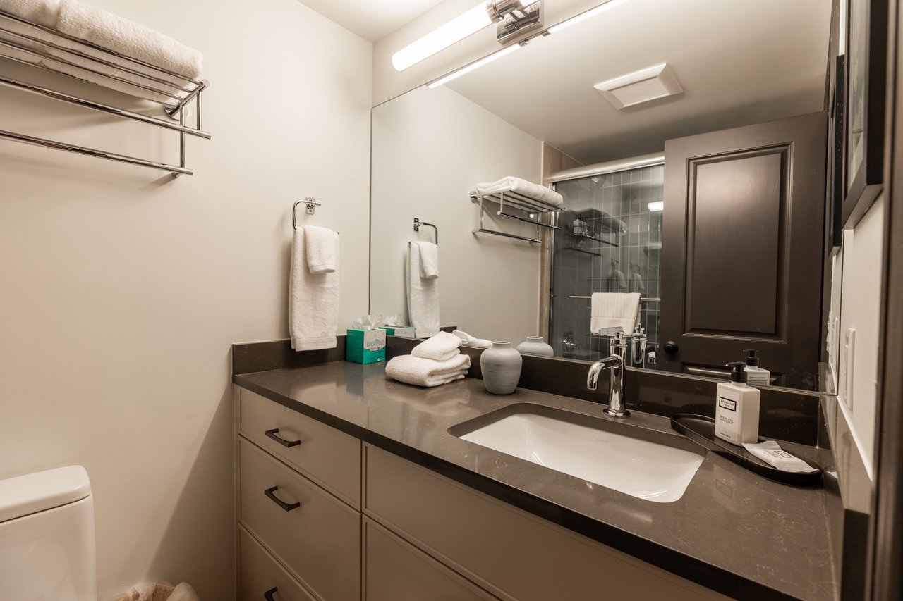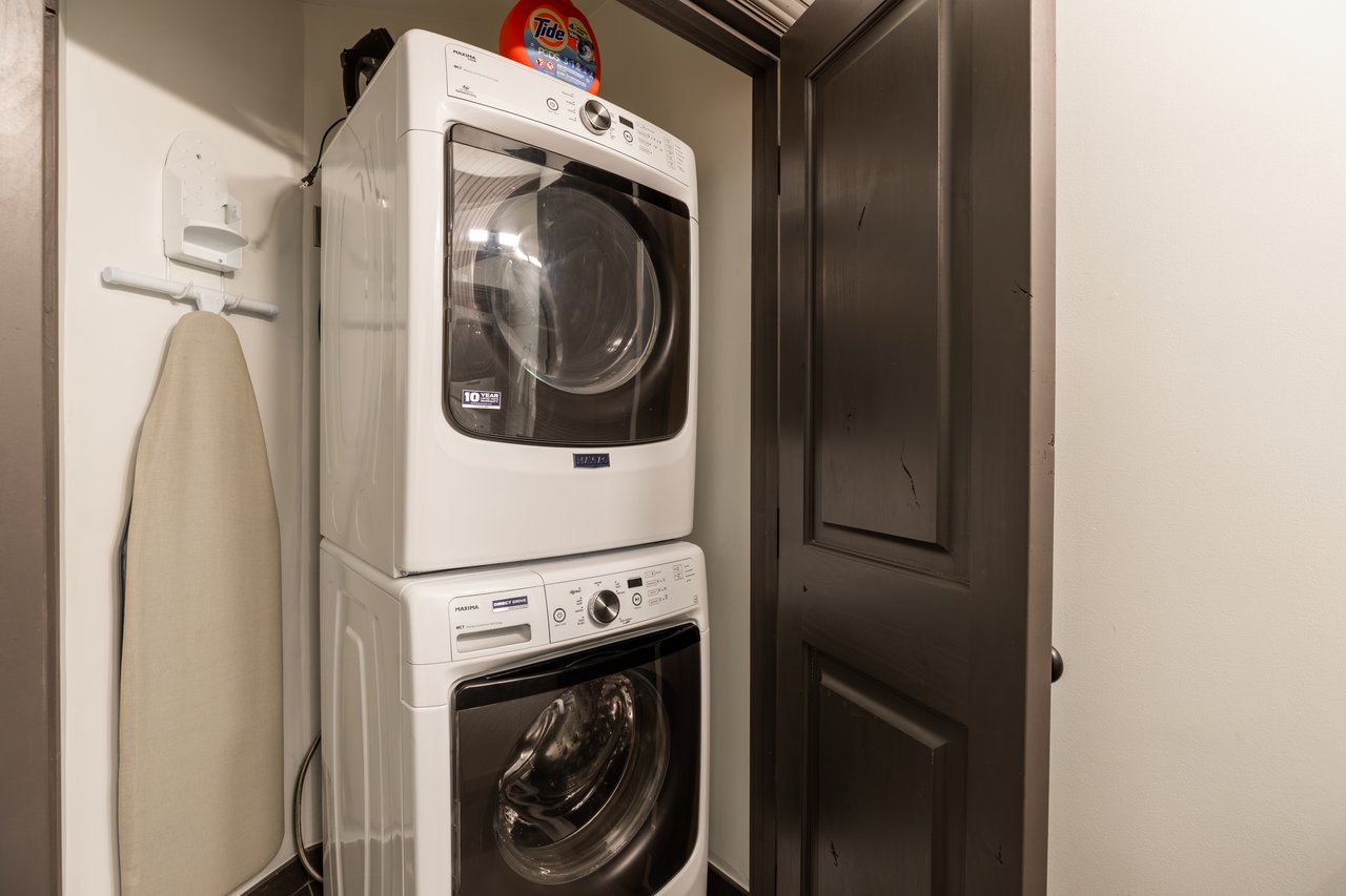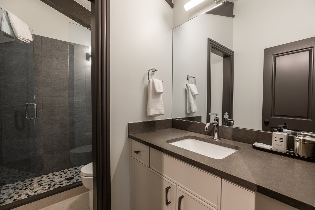 The upstairs primary as well as the downstairs guest bathroom are both en suite. Enjoy a soak or rinse in the shower/tub combos. The upstairs guest bathroom is atop the stairway, and all bathrooms are stocked with towels, shampoo, conditioner, lotion, and body wash. All bathrooms are stocked with towels, shampoo, conditioner, lotion, and body wash.